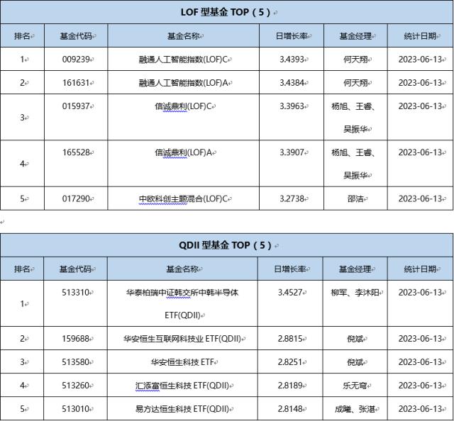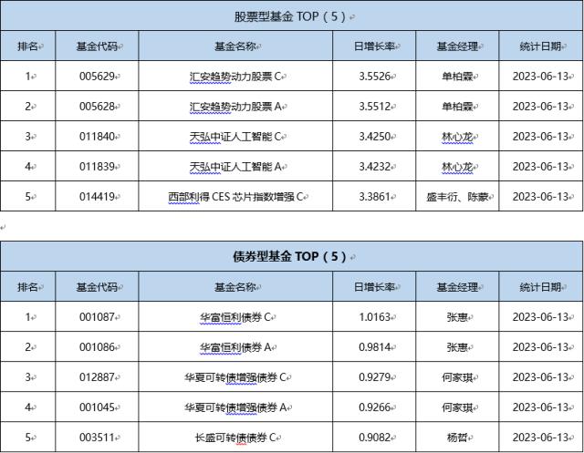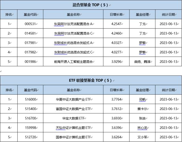 单基金方面,剔除掉 创新封基类型 基金的影响,6月13日业绩表现最好的基金为 东吴阿尔法灵活配置混合A,日增长率为4.2547%,其次为 东吴阿尔法灵活配置混合C,日增长率为4.2460%、东财成长优选混合发起式A,日增长率为4.0327%。