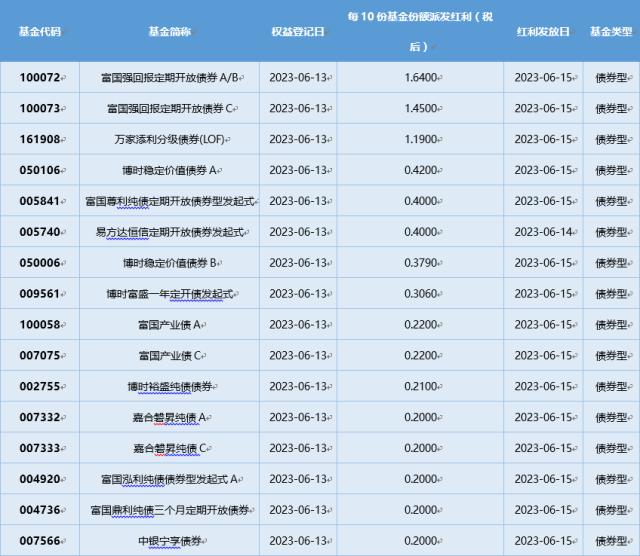 6月13日新发基金共有1只,为股票型基金,其中易方达纳斯达克100ETF(QDII)募集目标金额达3亿元;基金分红50只,多为债券型,派发红利最多的基金是富国强回报定期开放债券型证券投资基金,每10份基金份额派发红利1.6400元。