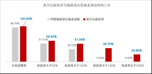 数据能更直观地体现这种效果。以易方达科翔、易方达新经济两只陈皓管理超过三年的偏股混合型基金为例,通过回测可以发现,自陈皓任职基金经理以来,在市场3100点左右买入并持有三年,有极高的概率获得正收益。