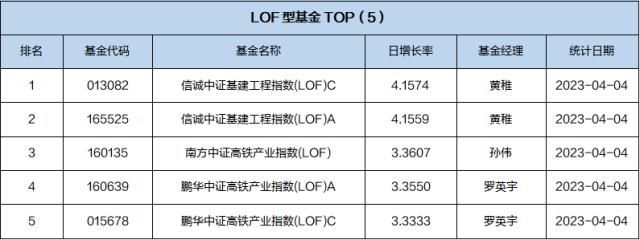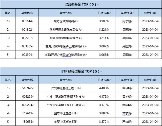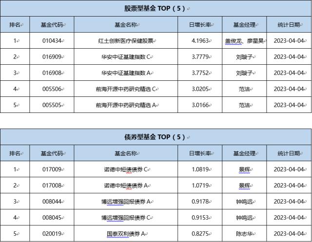 单基金方面,剔除掉 创新封基类型 基金的影响,4月4日业绩表现最好的基金为广发中证基建工程ETF,日增长率为4.4000 %,其次为红土创新医疗保健股票,日增长率为4.1963 %、广发中证基建工程ETF联接A,日增长率为4.1723 %。