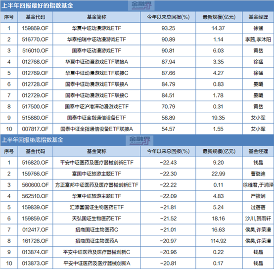 从TOP榜单来看,这一波表现较好的基金基本集中于AI、数字经济、TMT、“中特估”等板块。接下来,小编按基金大类,梳理了上半年指数基金回报最好和垫底、普通股票基金回报最好和垫底、偏股混合基金最好和垫底、以及增强指数基金最好和垫底。