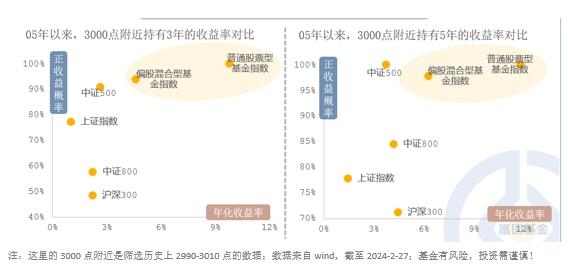 方法二:虽然从短期看,基金难跑赢宽基指数,但若拉长时间,结论恰恰相反。统计2005年以来在3000点附近,持有基金指数、核心宽基指数3年、5年的表现,可以发现两点:一是相比核心宽基指数,基金指数的年化收益率和正收益率概率更为优异;二是相比持有3年,持有5年的整体表现都会有不同程度的提升。这也告诉我们,基金投资要学会坚持和守候,不以涨喜,不以跌悲,耐得住寂寞,守得住岁月。