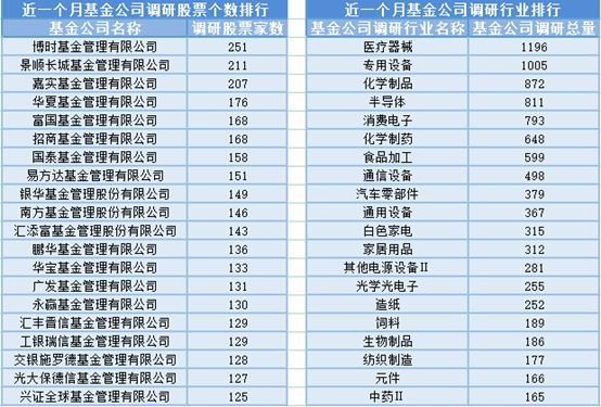 近一个月(4月15日-5月15日),博时基金参与公司调研的数量最多,共调研251家上市公司,然后调研较为活跃的还有景顺长城基金、嘉实基金和华夏基金,分别调研211家、207家、176家上市公司;从调研行业上来看,基金公司对医疗器械行业的上市公司调研次数最多,共有1196次,其次是专用设备行业,基金公司调研了1005次。