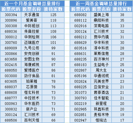 将时间周期缩短到最近一周(5月8日-5月15日)来看,基金调研数量第一的公司是盛美上海,属于半导体行业, 公司主要是批发:半导体专用设备的研发、生产和销售 公司主要从事半导体专用设备的研发、生产和销售,主要产品包括半导体清洗设备、半导体电镀设备、立式炉管设备和先进封装湿法设备等。公司坚持差异化竞争和创新的发展战略,通过自主研发的单片兆声波清洗技术、单片槽式组合清洗技术、电镀技术、无应力抛光技术和立式炉管技术等,向全球晶圆制造、先进封装及其他客户提供定制化的设备及工艺解决方案,有效提升客户的生产效率、提升产品良率并降低生产成本,共被38家基金机构调研;然后被调研数量较多的股票是鼎阳科技、深南电路和汇川技术,分别接受35家、33家和32家基金机构的调研。