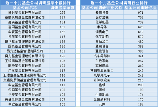 近一个月(4月23日-5月23日),博时基金参与公司调研的数量最多,共调研225家上市公司,然后调研较为活跃的还有景顺长城基金、嘉实基金和富国基金,分别调研197家、184家、153家上市公司;从调研行业上来看,基金公司对专用设备行业的上市公司调研次数最多,共有971次,其次是医疗器械行业,基金公司调研了752次。