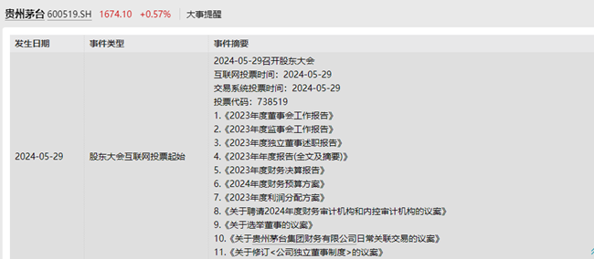因登记参会人数超过原定会议召开地点贵州省仁怀市茅台镇茅台国际大酒店会场容量,贵州茅台在5月27日晚间的公告中表示,调整公司2023年度股东大会现场会议召开地点,调整至贵州省仁怀市茅台镇茅台会议中心。截止5月29日14:06,贵州茅台二级市场上的股价微涨0.54%,报1673.69元/股。