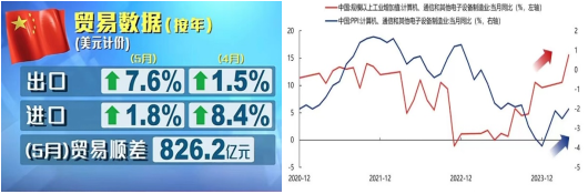 从数据层面来看,外需向好的态势非常明显。根据海关总署的数据,前五个月中国货物贸易出口同比增长6.1%,其中5月份出口增速达到7.6%。高端化、智能化、绿色化产品的出口表现尤为突出,前五个月船舶、电动汽车和家用电器的出口同比分别增长100.1%、26.3%和17.8%,外贸向好的态势继续巩固。同时,在新质生产力产业景气驱动下(如以计算机、通信和电子设备制造为代表的产业),中国第二产业开始从量价提升向利润提升的闭环迈进,科创属性的边际改善越发明显,产业出海叠加科技赋能的双强格局逐渐显现。