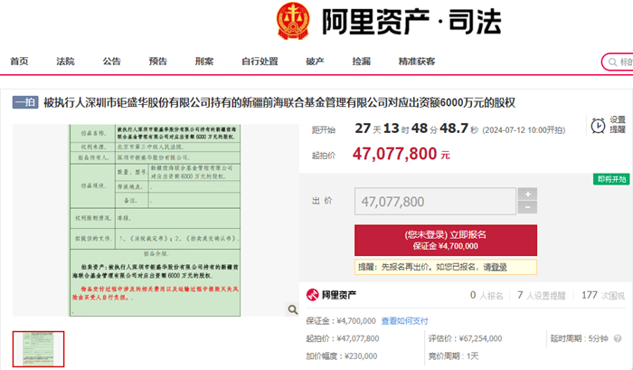 宝能系近年来面临着严重的偿债危机,为了缓解财务压力,其旗下资产正在经历一场频繁的变现潮。作为宝能系子公司之一,深圳市钜盛华股份有限公司近日决定将其所持有的新疆前海联合基金管理有限公司30%的股权进行拍卖。该股权的评估价为6725.4万元,但起拍价仅为4707.78万元,相当于7折起拍,这无疑为潜在买家提供了一个极具吸引力的投资机会。