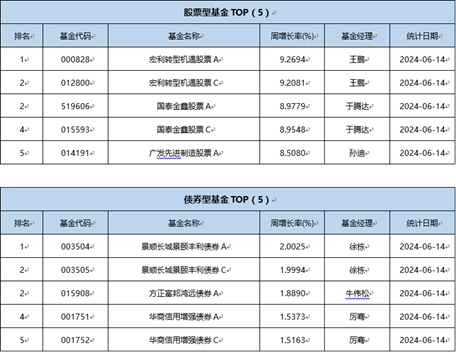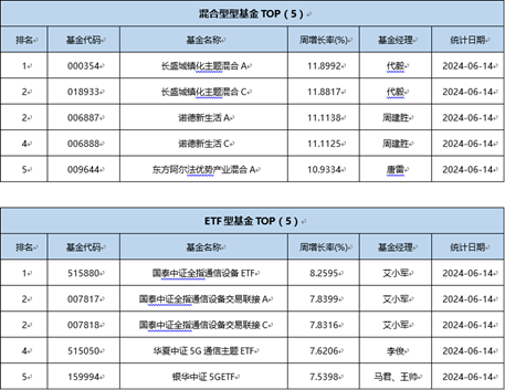 单基金方面,剔除掉创新封基类型基金的影响,上周业绩表现最好的基金为长盛城镇化主题混合A,周涨跌幅为11.8992%,为混合型基金;分基金类型看,同样剔除掉分级杠杆及固定收益两类基金的影响,股票型基金冠军为宏利转型机遇股票A,周涨跌幅为9.2694%;债券型基金冠军为景顺长城景颐丰利债券A,周涨跌幅为2.0025%; 混合型基金冠军为长盛城镇化主题混合A,周涨跌幅为11.8992%; 货币型基金冠军为长盛货币A,周涨跌幅为0.0527%;ETF型基金冠军为国泰中证全指通信设备ETF,周涨跌幅为8.2595% ;LOF型基金冠军为银华科创主题灵活配置混合(LOF),周涨跌幅为7.4056%;QDII基金冠军为华泰柏瑞中证韩交所中韩半导体ETF(QDII),周涨跌幅为4.1435%;下面是不同类型基金周涨跌幅TOP5 (剔除掉分级基金的影响)