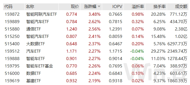 盘中非货币ETF中,625只上涨、70只持平、240只下跌。车路云成市场新风口,智能汽车类ETF领涨。