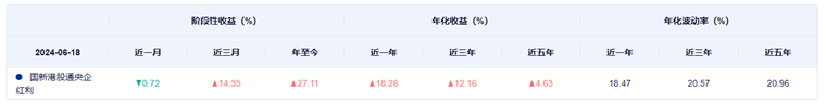 从编制方法来看,指数综合考虑了央企现金分红持续性和股息率,采用股息率调整后的自由流通市值加权,投资回报较为稳健,截至2024年截至6月18日,国新港股通央企红利指数近一月收益率-0.72%,近三月收益率14.35%,今年以来收益率27.11%,近三年12.16%。