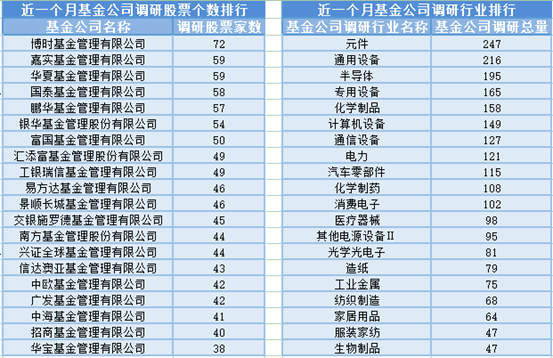 近一个月(5月20日-6月20日),博时基金参与公司调研的数量最多,共调研72家上市公司,然后调研较为活跃的还有嘉实基金、华夏基金和国泰基金,分别调研59家、59家、58家上市公司;从调研行业上来看,基金公司对元件行业的上市公司调研次数最多,共有247次,其次是通用设备行业,基金公司调研了216次。
