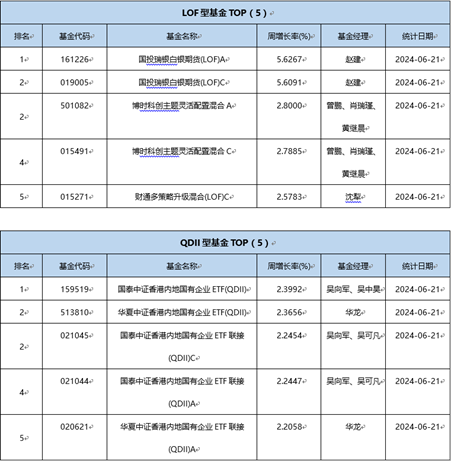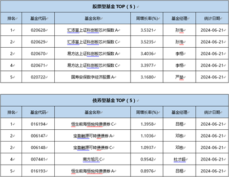 单基金方面,剔除掉创新封基类型基金的影响,上周业绩表现最好的基金为国投瑞银白银期货(LOF)A,周涨跌幅为5.6267%,为L0F型基金;分基金类型看,同样剔除掉分级杠杆及固定收益两类基金的影响,股票型基金冠军为汇添富上证科创板芯片指数A,周涨跌幅为3.5321%;债券型基金冠军为恒生前海恒悦纯债债券C,周涨跌幅为1.3958%; 混合型基金冠军为浙商汇金转型驱动灵活配置混合,周涨跌幅为5.6086%; 货币型基金冠军为太平日日金货币B,周涨跌幅为0.0687%;ETF型基金冠军为华安上证科创板芯片ETF,周涨跌幅为3.7600% ;LOF型基金冠军为国投瑞银白银期货(LOF)A,周涨跌幅为5.6267%;QDII基金冠军为国泰中证香港内地国有企业ETF(QDII),周涨跌幅为2.3992%;下面是不同类型基金周涨跌幅TOP5 (剔除掉分级基金的影响)