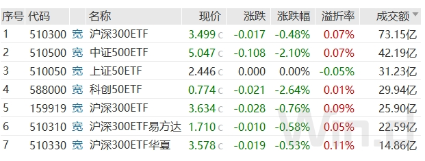 6月24日,A股大幅下跌,两市红盘个股仅300多只。截止收盘,上证指数跌1.17%报收于2963.10点;深成指跌1.55%报收于8924.17点;创业板指跌1.39%报收于1731.51点,万得全A总成交6986亿元。盘面上,多只沪深300ETF、中证500ETF和上证50ETF基金成交额大幅放大,其中华泰柏瑞沪深300ETF成交额为73.15亿元,南方中证500ETF成交额为42.19亿元,华夏上证50ETF成交额为31.23亿元,嘉实沪深300ETF成交额为25.90亿元,易方达沪深300ETF成交额为22.59亿元,华夏沪深300ETF成交额为14.86亿元。