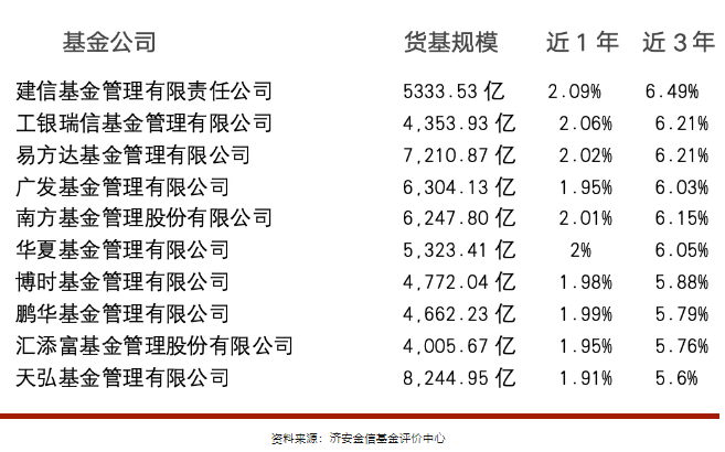 济安金信基金评价中心统计数据显示,对比10大基金公司货币基金的近3年业绩看,第一名是建信基金为6.49%,工银瑞信和易方达并列第二,为6.21%,远远跑赢市场平均水平。