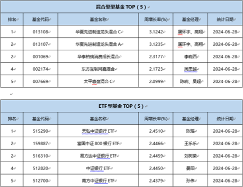 单基金方面,剔除掉创新封基类型基金的影响,上周业绩表现最好的基金为华夏先进制造龙头混合C,周涨跌幅为3.1242%,为混合型基金;分基金类型看,同样剔除掉分级杠杆及固定收益两类基金的影响,股票型基金冠军为鹏华文化传媒娱乐股票,周涨跌幅为2.4119%;债券型基金冠军为光大保德信中高等级债券C,周涨跌幅为1.5672%; 混合型基金冠军为华夏先进制造龙头混合C,周涨跌幅为3.1242%; 货币型基金冠军为红土创新优淳货币B,周涨跌幅为0.0679%;ETF型基金冠军为天弘中证银行ETF,周涨跌幅为2.4510% ;LOF型基金冠军为富国中证银行指数A,周涨跌幅为2.3273%;QDII基金冠军为摩根日本精选股票(QDII)A,周涨跌幅为2.8076%;下面是不同类型基金周涨跌幅TOP5 (剔除掉分级基金的影响)