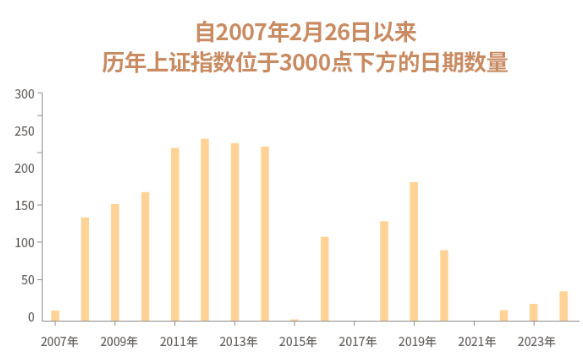 首先,当我们回顾A股历史,上证指数曾50余次跌下3000点,但自2015年至今的行情中,低于3000点的天数占比明显下降。分年度统计,2021年以来的近2年半中,上证指数低于3000点的日期数量较此前大幅减少,而经历波折之后的大盘,最终都能重新企稳,开启一轮行情。