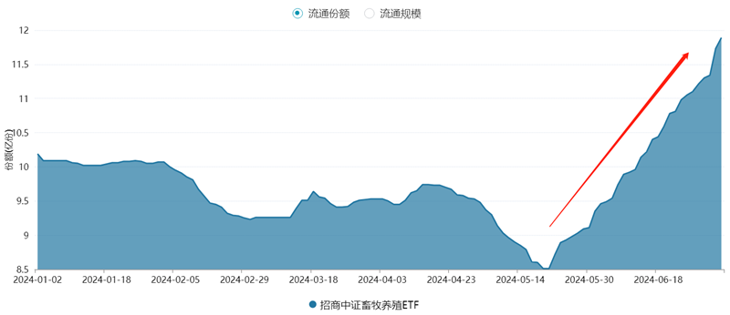 根据上交所数据,自5月22日至7月3日,畜牧养殖ETF(516670)份额连续30日增长3.38亿份,增幅近40%,增幅位居同主题ETF第一,期间获得资金净申购合计约2.3亿元。