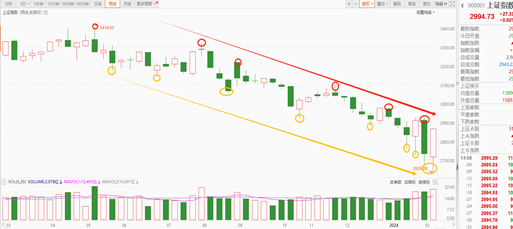 一季度是延续自2023年5月份以来的下跌趋势,而且是在跌速最快、杀伤力最大的时期。(下图:2023.5-2024.2上证指数周线趋势)