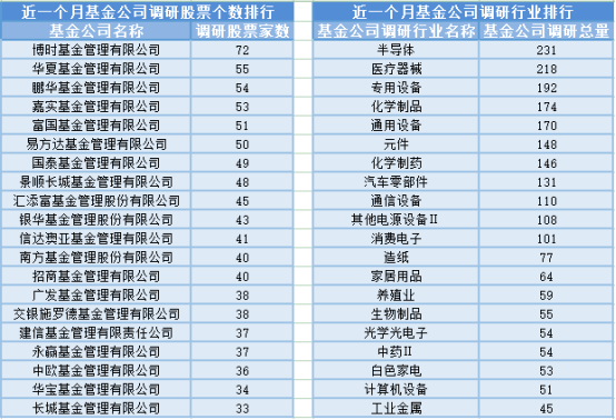 近一个月(6月11日-7月11日),博时基金参与公司调研的数量最多,共调研72家上市公司,然后调研较为活跃的还有华夏基金、鹏华基金和嘉实基金,分别调研55家、54家、53家上市公司;从调研行业上来看,基金公司对半导体行业的上市公司调研次数最多,共有231次,其次是医疗器械行业,基金公司调研了218次。