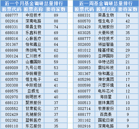 将时间周期缩短到最近一周(7月4日-7月11日)来看,基金调研数量第一的公司是荣昌生物,属于生物制品行业, 公司主要经营范围是研发、生产和销售医药产品、诊断试剂产品,以及进行与上述产品及其研发相关的技术服务、技术转让,货物或技术进出口(国家禁止或涉及行政审批的货物和技术进出口除外)。(依法须经批准的项目,经相关部门批准后方可开展经营活动),共被74家基金机构调研;然后被调研数量较多的股票是恒生电子、兆驰股份和大豪科技,分别接受42家、37家和35家基金机构的调研。