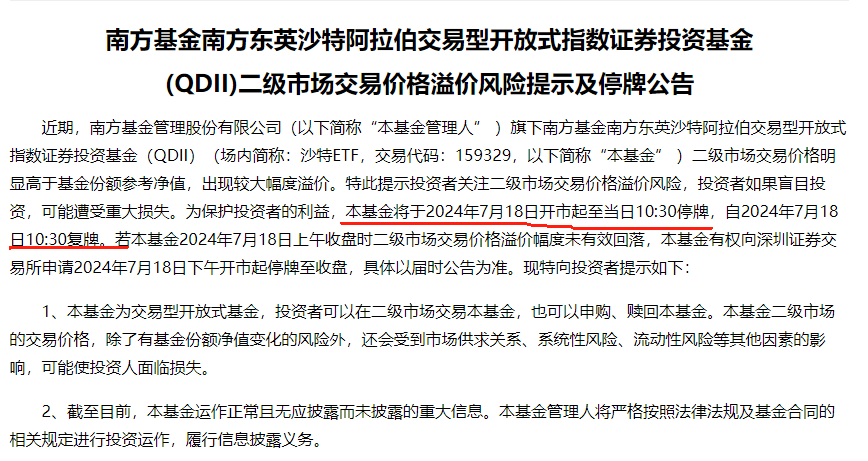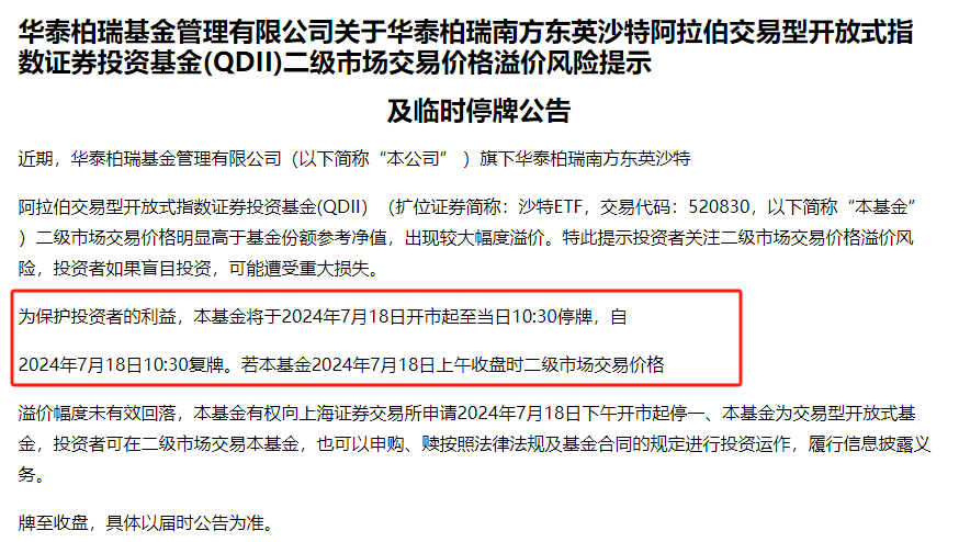 7月16日上市的华泰柏瑞基金、南方基金旗下首批沙特ETF连续2个交易日涨停并保持高溢价状态。Wind数据显示,两只沙特ETF溢价率双双突破15%,位居ETF市场前位,单日合计成交额突破20亿元。7月18日开市起停牌,自7月18日10:30复牌。