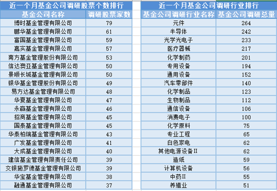 近一个月(6月19日-7月19日),博时基金参与公司调研的数量最多,共调研79家上市公司,然后调研较为活跃的还有鹏华基金、富国基金和嘉实基金,分别调研61家、59家、57家上市公司;从调研行业上来看,基金公司对元件行业的上市公司调研次数最多,共有264次,其次是半导体行业,基金公司调研了242次。
