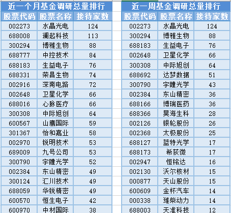 将时间周期缩短到最近一周(7月12日-7月19日)来看,基金调研数量第一的公司是水晶光电,属于光学光电子行业, 公司主要经营范围是光电子元器件、光学元器件制造、加工,经营本企业自产产品及技术的出口业务,经营本企业生产、科研所需的原辅材料、机械设备、仪器仪表、零配件及技术的进口业务(国家限定公司经营和国家禁止进出口的商品及技术除外),经营进料加工和“三来一补”业务,电子技术咨询服务,机械设备租赁,自有房屋租赁,物业管理,共被124家基金机构调研;然后被调研数量较多的股票是博雅生物、生益电子和卫星化学,分别接受88家、76家和66家基金机构的调研。