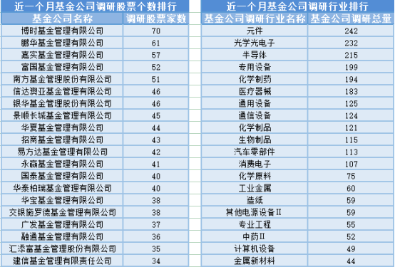 近一个月(6月22日-7月22日),博时基金参与公司调研的数量最多,共调研70家上市公司,然后调研较为活跃的还有鹏华基金、嘉实基金和富国基金,分别调研61家、57家、52家上市公司;从调研行业上来看,基金公司对元件行业的上市公司调研次数最多,共有242次,其次是光学光电子行业,基金公司调研了232次。