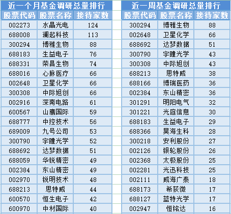 从个股调研情况上来看,最近1个月(6月22日-7月22日)最受公募基金关注的是水晶光电,属于光学光电子行业,主营业务为光电子元器件、光学元器件制造、加工,经营本企业自产产品及技术的出口业务,经营本企业生产、科研所需的原辅材料、机械设备、仪器仪表、零配件及技术的进口业务(国家限定公司经营和国家禁止进出口的商品及技术除外),经营进料加工和“三来一补”业务,电子技术咨询服务,机械设备租赁,自有房屋租赁,物业管理,共有124家基金管理公司参与调研,其次是澜起科技和博雅生物,分别接受113家、88家基金管理公司的调研;