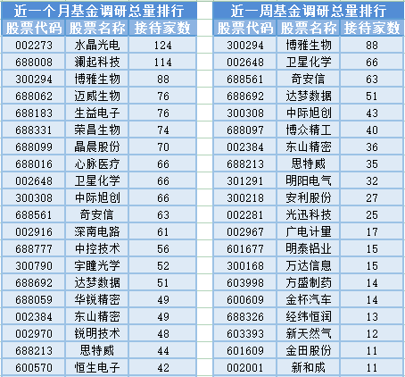 从个股调研情况上来看,最近1个月(6月24日-7月24日)最受公募基金关注的是水晶光电,属于光学光电子行业,主营业务为光电子元器件、光学元器件制造、加工,经营本企业自产产品及技术的出口业务,经营本企业生产、科研所需的原辅材料、机械设备、仪器仪表、零配件及技术的进口业务(国家限定公司经营和国家禁止进出口的商品及技术除外),经营进料加工和“三来一补”业务,电子技术咨询服务,机械设备租赁,自有房屋租赁,物业管理,共有124家基金管理公司参与调研,其次是澜起科技和博雅生物,分别接受114家、88家基金管理公司的调研;