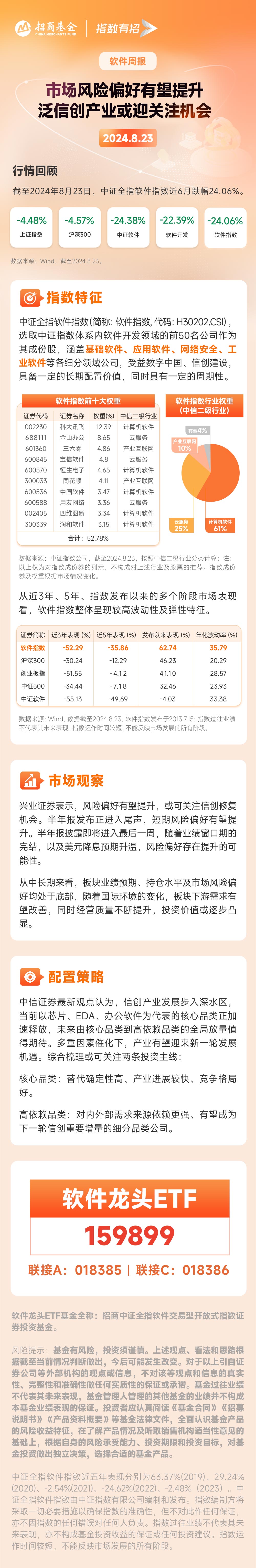 软件龙头ETF(159899)跟踪中证全指软件指数,该指数主要选取中证指数体系内软件开发领域的前50名公司作为其成份股,涵盖基础软件、应用软件、网络安全、工业软件等各细分领域公司,前十权重股覆盖科大讯飞、金山办公、三六零、宝信软件、恒生电子、同花顺、中国软件、用友网络、四维图新、润和软件,受益数字中国、信创建设,或具备一定的长期配置价值。场外可通过联接基金(A:018385;C:018386)进行关注。