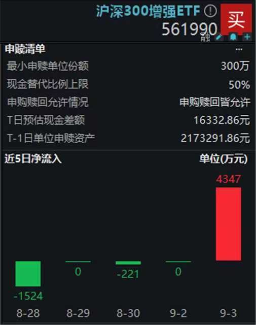 9月3日,A股三大指数收盘涨跌不一,沪指跌0.29%险守2800点关口,沪深两市5806亿元,较上日缩量1251亿元。沪深300相关ETF尾盘再度异动放量,沪深300增强ETF(561990)单日成交近1亿,较前日翻番,单日获超4300万净申购。