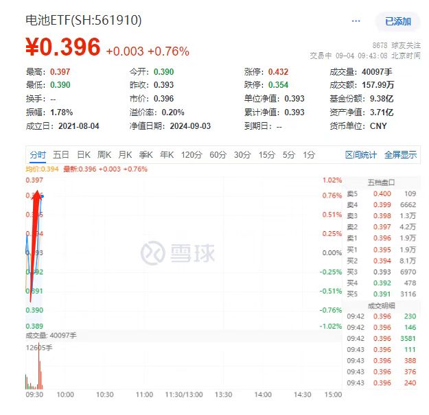 9月4日,锂电池、固态电池概念反复活跃。截至9时46分,表征板块的电池ETF(561910)垂直拉升一度涨1.02%;成分股南都电源、星源材质、当升科技、恩捷股份、盟固利、尚太科技涨幅居前。