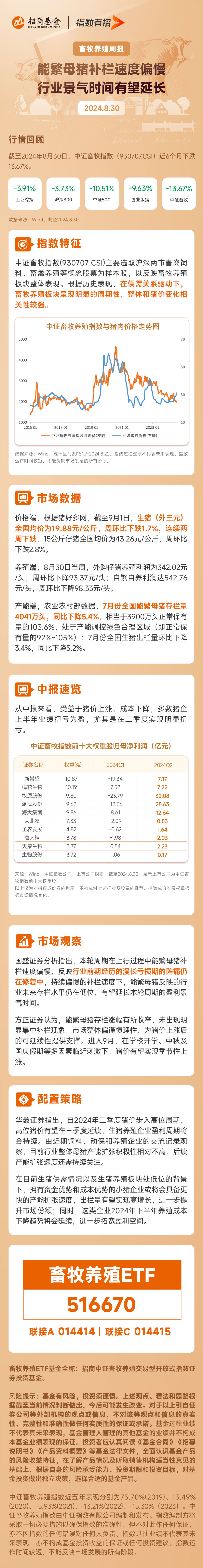 畜牧养殖ETF(516670)跟踪的中证畜牧指数(930707.CSI)主要选取沪深两市畜禽饲料、畜禽养殖等概念股票为样本股,以反映畜牧养殖板块整体表现。根据历史表现,在供需关系驱动下,畜牧养殖板块呈现明显的周期性,整体和猪价变化相关性较强。