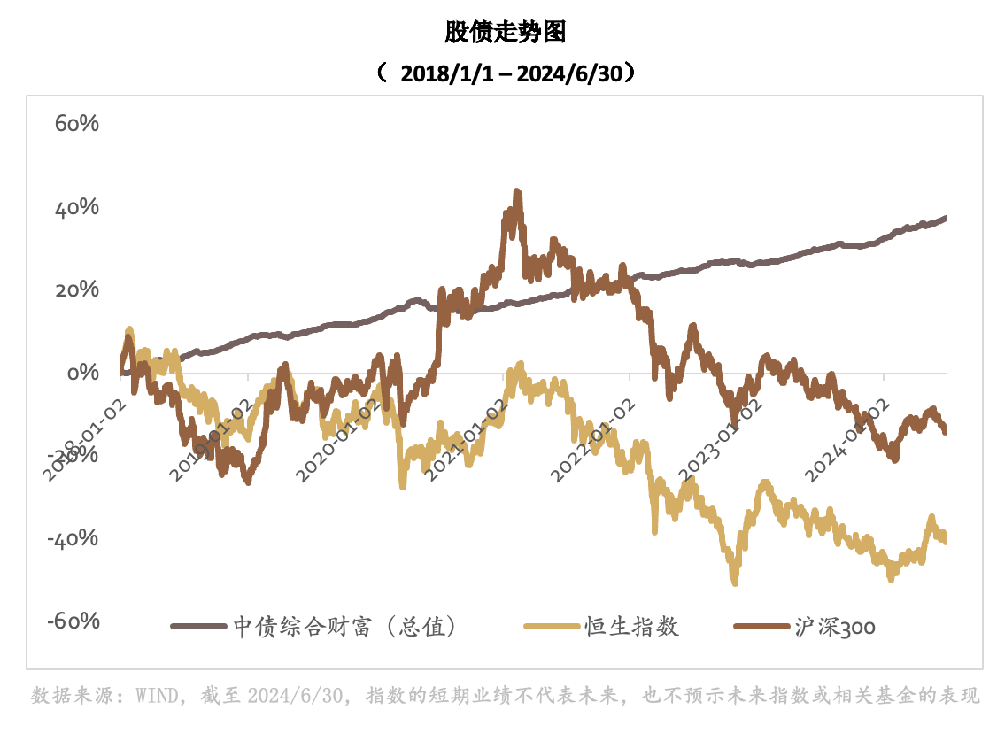 数据来源:WIND.2019/8/1-2024/7/31.指数过往表现不预示未来,也不代表相关基金表现。指数代码分别为:沪深300指数(000300.SH)、偏债混合型基金指数(885003.WI)、纯债债基指数(930609.CSI)。