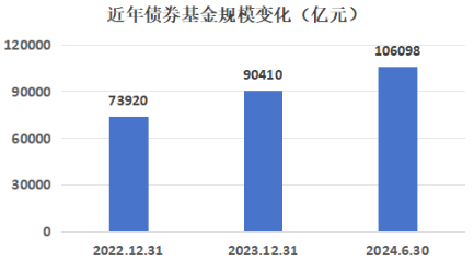 市场持续震荡之下,投资者风险偏好下行,债券基金近两年来热度不减,规模增长迅速。据光大证券研报,债券基金2023年全年增长1.65万亿元,年底总规模超9万亿元,2024年上半年增长1.57万亿元,环比增长17.35%,最新规模超10万亿元。从各细分类型来看,中长期纯债基金、短期纯债基金、被动指数型债券基金等快速发展,今年上半年份额环比增长分别为12.15%、46.19%、23.57%,投资者配置热情较高。
