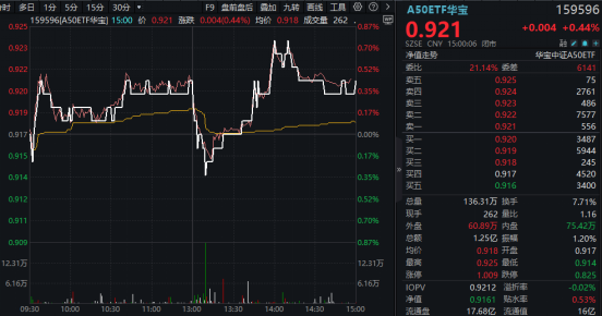 9月18日,大盘午后波动较大,沪指跳水跌破2700点后反弹收涨,A50超大盘龙头鼎立助攻!龙头宽基A50ETF华宝(159596)同步探底回升,一度上探0.76%。截至收盘,A50ETF华宝(159596)场内价格上涨0.44%终结此前两连跌,全天放量成交1.25亿元。