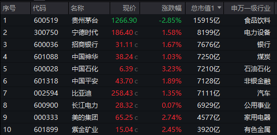 中证A50指数市值前10成份股中仅贵州茅台下跌,其余9股全部上涨。值得关注的是,上涨个股多具备高股息特征,包括招商银行、中国神华、中国石化、中国平安、长江电力等。