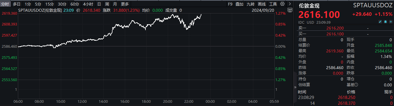 黄金是全球大类资产中备受关注的品种。9月20日,金价走强,带动美股黄金股集体上涨。其中,美国黄金公司涨超4%,New Gold、哈莫尼黄金、金田涨超2%,金罗斯黄金、科尔黛伦矿业、沙尘暴黄金涨超1%。伦敦金现今日盘中一度涨至2619.36美元/盎司,再创历史新高。