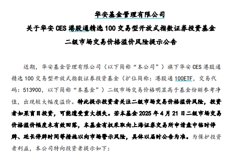 面对这种异常的市场表现,基金公司也纷纷发出风险提示。华安基金在4月21日发布公告称,旗下华安CES港股通精选100交易型开放式指数证券投资基金(即港股通 100ETF)二级市场交易价格明显高于基金份额参考净值,出现较大幅度溢价。