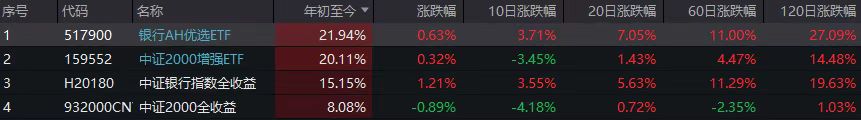 “超强哑铃策略”再发力!银行AH优选ETF(517900)、中证2000增强ETF(159552)联袂上行,年内涨幅双双超20%