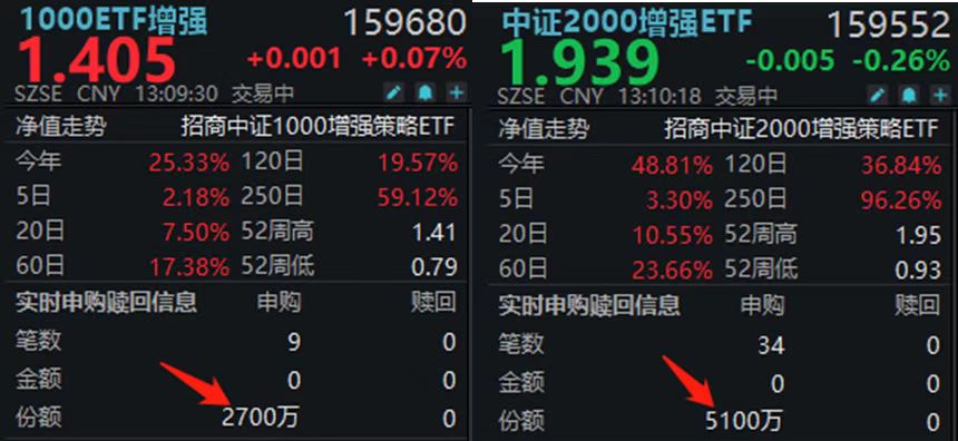 “小盘双子星"盘中联袂吸金,1000ETF增强(159680)、中证2000增强ETF(159552)盘中合计净申购近1.4亿