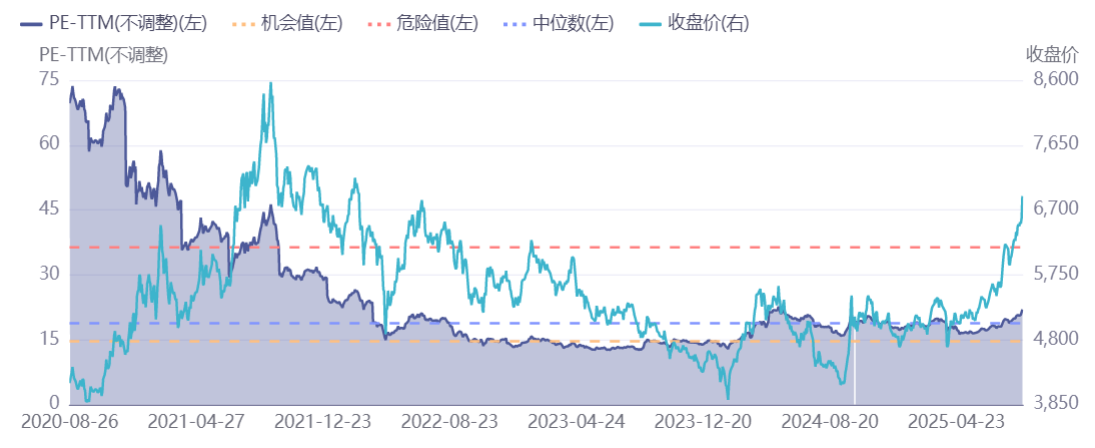 一般而言,在行情软件中(如同花顺、万得等)可以查询到某一只股票或某一只指数的估值情况。以某行业类指数的PE估值为例,如下图所示,该指数截至2025年8月25日的PE为22.01倍,略高于近5年PE的中位数18.84倍,距离危险值(近5年的80%分位数)36.36倍较远,风险相对可控。