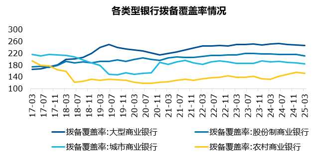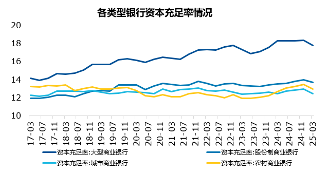 在各类银行中,国有大行由于资本补充渠道充足、规模优势明显,整体资本充足率水平更高,股份行次之。如下图所示,截至2025年一季度资本充足率为17.79%。