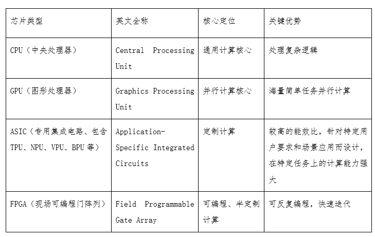 本期,我们聚焦算力产业链的上游——芯片,主要负责数据的计算,包括CPU、GPU、ASIC、FPGA等。它们有的擅长“多面手”工作,能处理各种复杂任务,有的专攻单一领域,把一件事做到极致。先看一张对比表,快速get核心差异: