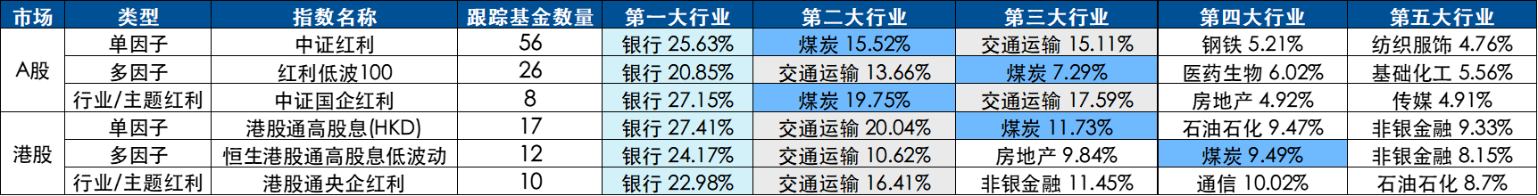 大部分红利指数以银行为最高权重行业,此外,交通运输、煤炭等行业的权重也通常占比较高。