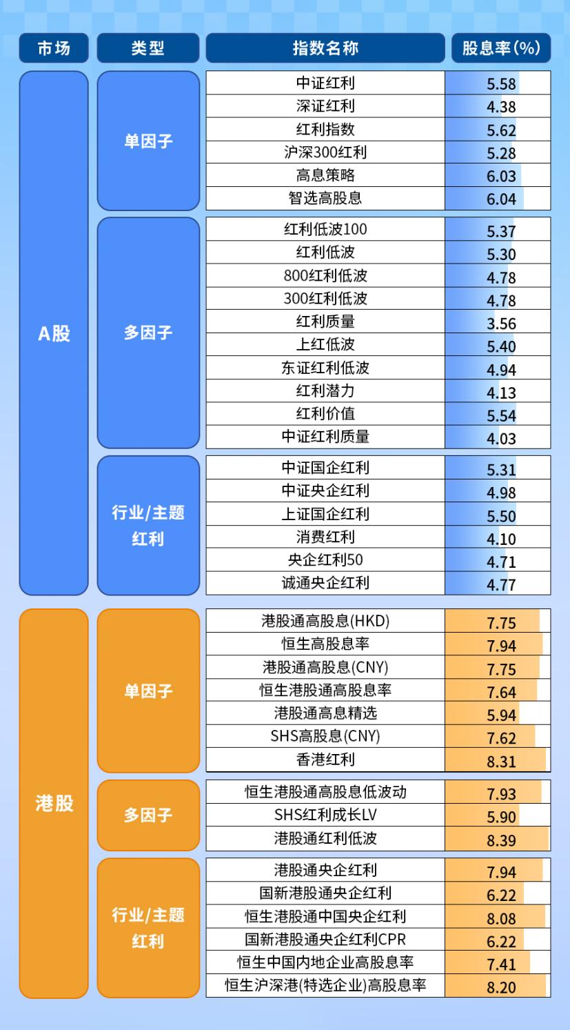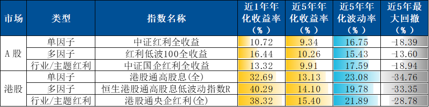 首先,可按成份股的选样范围分为A股红利指数和港股红利指数。从近些年的情况来看,港股红利指数的波动率和股息率通常都高于A股红利指数;