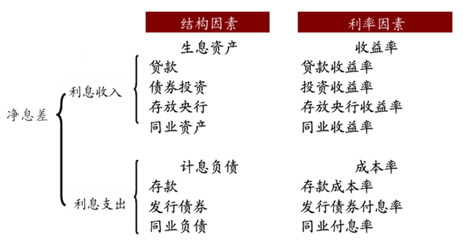 所以,想要更准确地分析净息差,通常还要根据结构因素和利率因素对它进行进一步的拆解,如下图所示:
