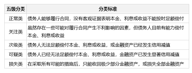 监管要求商业银行按照借款人是否能按时足额偿还贷款本息的风险程度将贷款分为五类,也就是“贷款五级分类”(见下表)。其中,次级、可疑、损失三类贷款合称为不良贷款。